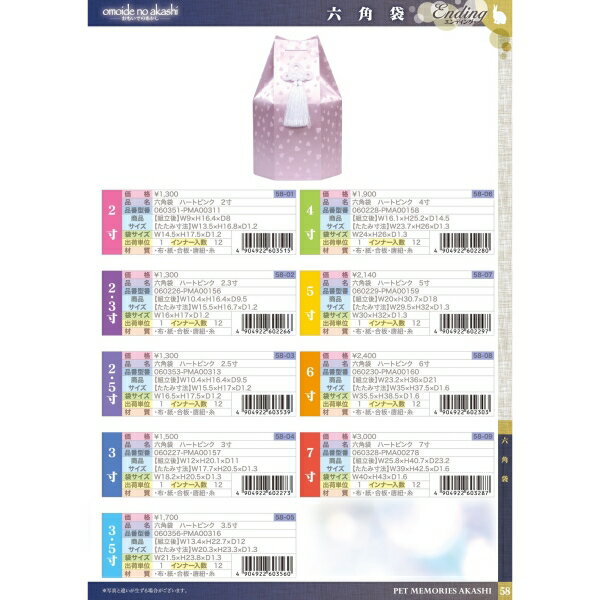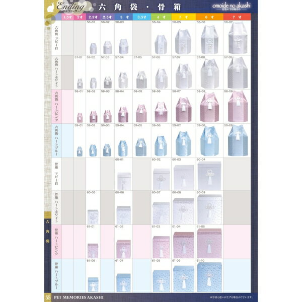 六角袋 ハートピンク 2寸 [ペット骨壷・分骨壺]六角袋 ハートピンク 2.3寸 [ペット骨壷・分骨壺]六角袋 ハートピンク 2.5寸 [ペット骨壷・分骨壺]六角袋 ハートピンク 3寸 [ペット骨壷・分骨壺]六角袋 ハートピンク 3.5寸 [ペット骨壷・分骨壺]六角袋 ハートピンク 4寸 [ペット骨壷・分骨壺]六角袋 ハートピンク 6寸 [ペット骨壷・分骨壺]六角袋 ハートピンク 7寸 [ペット骨壷・分骨壺]【六角袋 ハートピンク 5寸 [ペット骨壷・分骨壺]】広告文責(有)イースクエアTEL:0120-532-772W20×H30.7×D18(組立後)■生産地:中国■素材・成分:布・紙・合板・唐紐・糸たたみ寸法:W29.5×H32×D1.3■パッケージ:個包装ハート模様が可愛い六角袋5寸※お客さま都合による、ご注文後の[キャンセル][変更][返品][交換]はお受けできませんのでご注意下さいませ。